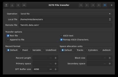 Żeby przesłać lokalny plik tekstowy do emulowanego MVS, najwygodniej użyć wbudowanego w klienta 3270 mechanizmu przesyłania plików: